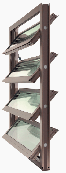 Louvre windows consist of one or more louvres lying one on top of the other, which open as pivoting sashes via a horizontal axis of rotation. The part of the wing below the axis of rotation opens outwards and the part above it opens inwards. As a rule, the axis of rotation is in the middle of the slat height; can also be offset up to 1/3 – 2/3 after technical clarification(automated application only)