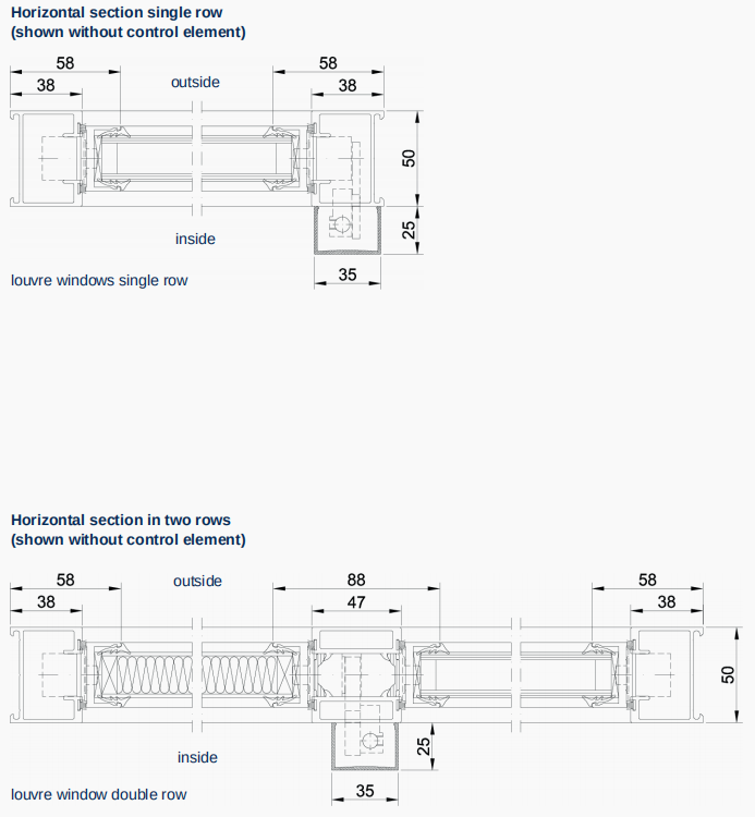 Dimensions | Frame Width Frame Height Louvre Blade Height | min. 300mm up to 2000mm min. 300mm up to any height min. 120mm up to 400mm |